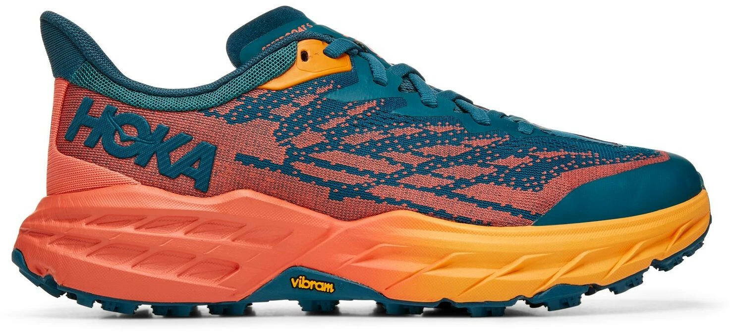 De Speedgoat, een werkpaard voor technische trails, is terug met minder gewicht en meer tractie dan ooit tevoren. Een nieuwe schoen van de buitenzool tot de veters, dit trail beest is bijgewerkt met Vibram Megagrip met Traction Lug voor betere grip op losse ondergrond. De Speedgoat 5 heeft dezelfde stapelhoogte en hetzelfde rockerprofiel, maar gebruikt een lichtere tussenzoolcompound en een robuustere, dubbellaagse jacquard mesh die vertrouwen inboezemt op elk terrein.
