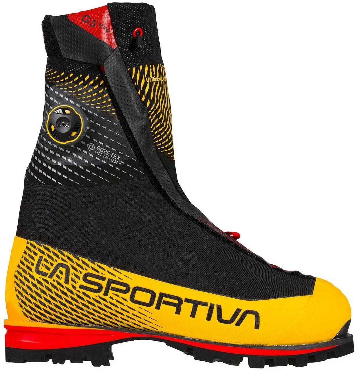 De G5 Evo is een zeer technische, waterafstotende bergschoenen voor bergbeklimmen op grote hoogte, ijsklimmen en gebruik in koude gebieden. Snel en gemakkelijk aan te trekken dankzij de lagere vetersluiting met BOA Fit System buiten de gaiter. Het systeem maakt een veilige sluiting mogelijk, zelfs met handschoenen en zonder de rits te moeten openen. Het Power-Strap klittenband op het bovenste deel van de schacht zorgt bovendien voor een veilige en nauwkeurige sluiting en voorkomt in combinatie met de verstelbare beschermkraag dat sneeuw en ijs binnendringen. Net als alle andere producten uit de High Mountain lijn van La Sportiva is de G5 Evo gemaakt van sneldrogende materialen die een langdurig gebruik bevorderen. Maximale bescherming tegen het weer dankzij de waterafstotende gaiter met thermisch gelaste rits en de binnenste gelaste naden met innovatieve UltraSonic-Welding technologie, die een naadloze aansluiting van de materialen mogelijk maakt en de schoen daardoor extra waterafstotend maakt. Volume en gewicht zijn geminimaliseerd: de beschermende velg is gemaakt van ultralicht en slijtvast PU TechLite-materiaal. De tussenzool is gemaakt van isolerend Honey-Comb-Tech carbon met een dikte van 3 mm. De thermische prestaties worden verder verbeterd door het GORE-TEX INFINIUM THERMIUM Insulation Technology membraan. Dit membraan omhult het bovenwerk vanaf de voorkant, inclusief de tussenzool voor betere thermische prestaties op de teen, zelfs als je niet veel beweegt. G5 EVO combineert de warmte-isolerende eigenschappen van een dubbelschalige schoen met de lichtheid en het beperkte volume van een enkelschalige schoen. Gimme Five, G5.